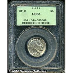<B>1919<5C> MS64 PCGS.</B></I> Fully struck with smooth, satiny mint luster. At first the surfaces appear brilliant, but close examination shows just the slightest hint of toning on each side. A worthwhile early P-mint and an excellent value in this grade. <BR><BR><B>Important notice:</B> Heritage usually auctions material at the rate of 200-250 lots per hour. On some occasions eBay Live bid software or the Internet may not be able to keep up with the pace of the auction. We recommend placing a realistic absentee bid now as insurance to avoid disappointment. Occasionally the auctioneer may eliminate or reject an eBay Live bid, and the auctioneer may also reopen a lot after the close of the eBay live bidding (usually because we missed an audience bid), and may reject your bid even if it shows you as the winning bidder. By bidding via eBay Live, you agree that Heritage may award the lot to another bidder at its sole discretion under the circumstances described above or any other reasonable circumstances. Since eBay bids are not shown to us until we open the lot on the floor, we treat those bids just like floor bids. In most cases the floor responds before the eBay bid is presented to us, due to Internet lag time, so for consistency we have made it a policy that floor bids are always considered first over tie eBay live bids. Also please note that all Heritage lots purchased through eBay Live carry a 20% Buyer's Premium. Please make sure you read the Terms and Conditions before you bid.