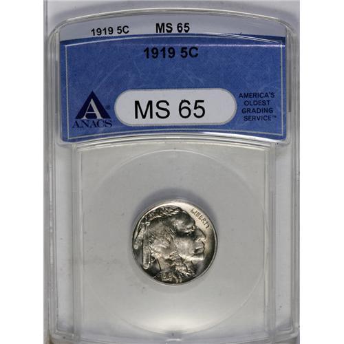 <B>1919<5C> MS65 ANACS.</B></I> Gentle battleship-gray and copper-gold toning visits lustrous and essentially mark-free surfaces. Minute flyspecks on the left obverse do not distract.