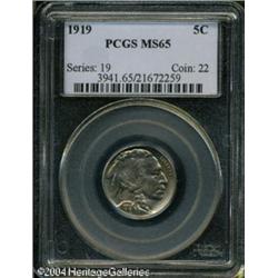 1919 5C MS65 PCGS. An uncommonly well struck Gem w <B>1919 5C MS65 PCGS.</B></I> An uncommonly well struck Gem with pleasing luster and attractive chestnut and gunmetal-gray colors. A lovely piece suitable for a quality Registry Set. <BR><BR><B>Important notice:</B> Heritage usually auctions material at the rate of 200-250 lots per hour. On some occasions eBay Live bid software or the Internet may not be able to keep up with the pace of the auction. We recommend placing a realistic absentee bid now as insurance to avoid disappointment. Occasionally the auctioneer may eliminate or reject an eBay Live bid, and the auctioneer may also reopen a lot after the close of the eBay live bidding (usually because we missed an audience bid), and may reject your bid even if it shows you as the winning bidder. By bidding via eBay Live, you agree that Heritage may award the lot to another bidder at its sole discretion under the circumstances described above or any other reasonable circumstances. Since eBay bids are not shown to us until we open the lot on the floor, we treat those bids just like floor bids. In most cases the floor responds before the eBay bid is presented to us, due to Internet lag time, so for consistency we have made it a policy that floor bids are always considered first over tie eBay live bids. Also please note that all Heritage lots purchased through eBay Live carry a 20% Buyer's Premium. Please make sure you read the Terms and Conditions before you bid. This lot is being auctioned in conjunction with a live floor auction by Heritage Galleries & Auctioneers. All final auction and invoice information will be supplied by Heritage Galleries & Auctioneers, and all other information should be considered preliminary. Lot:5580
