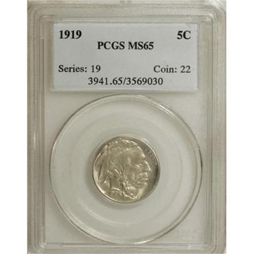 <B>1919 5C MS65 PCGS.</B></I> PCGS Population (324/129). NGC Census: (147/42). Mintage: 60,868,000. Numismedia Wsl. Price for NGC/PCGS coin in MS65: $500. (#3941)<BR><BR><B>Coin Engraver:</B> James E. Fraser<BR><BR><b>Shipping:</b> Coins & Currency (<a target="_blank" href="http://www.heritageauctions.com/common/shipping.php">view shipping information</a>)