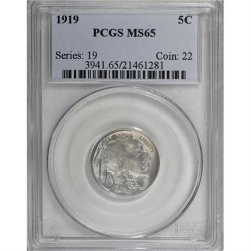<B>1919 5C MS65 PCGS.</B></I> This impressive Gem is untoned and highly lustrous, with remarkably clean surfaces and sharply struck design elements. Mechanical doubling is noticeable on all the letters of LIBERTY. <BR><BR><B>Coin Engraver:</B> James E. Fraser<BR><BR><b>Shipping:</b> Coins & Currency (<a target="_blank" href="http://www.heritageauctions.com/common/shipping.php">view shipping information</a>)