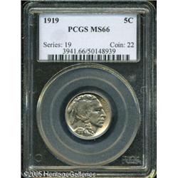 <B>1919 5C MS66 PCGS.</B></I> Well struck with attractive light toning and a small contact mark on the Indian's jaw, which you may not be able to see without a magnifying glass. An exceptional premium Gem. Population: 94 in 66, 7 finer (1/05). Lot:5979