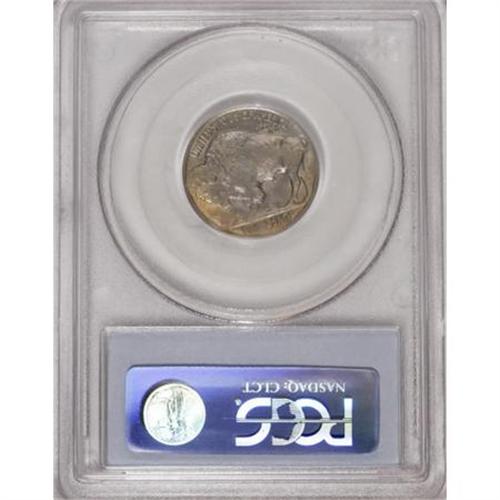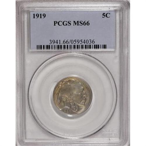<B>1919 5C MS66 PCGS.</B></I> Swirling luster and eye-catching patina are the prime attributes of this carefully preserved Premium Gem. Gold-orange, pink-peach, and nickel-blue toning drapes each side. PCGS has graded seven finer pieces (2/08).<BR><BR><B>Coin Engraver:</B> James E. Fraser<BR><BR><b>Shipping:</b> Coins & Currency (<a target="_blank" href="http://www.heritageauctions.com/common/shipping.php">view shipping information</a>)