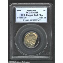 1919 5C Nickel-22% Ragged End Clip-MS63 PCGS. Distinguished by its tapered edge, this coin was punched out of what was left of the strip of metal from which the planchets were made. Fully struck on the obverse, each side is lightly and evenly toned. Important notice: We expect to be auctioning lots at the rate of 200-250 per hour. Sometimes eBay Premier live bid software cannot keep up with that pace, so we strongly recommend that you place a realistic proxy bid now as insurance to avoid disappointment. Also please note that all Heritage/CAA lots purchased through eBay Premier carry a 20% Buyer's Premium. Please make sure you read the Terms and Conditions.