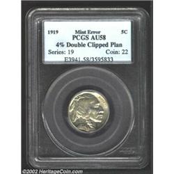 1919 5C Nickel--4% Double Clipped Planchet--AU58 PCGS. Slightly clipped between 12 and 1 o'clock and again between 6 and 7 o'clock. Several short scratches are seen in the lower right obverse field. Lustrous and lightly toned with strong striking details. Important notice: We expect to be auctioning lots at the rate of 200-250 per hour. Sometimes eBay Premier live bid software cannot keep up with that pace, so we strongly recommend that you place a realistic proxy bid now as insurance to avoid disappointment. Also please note that all Heritage/CAA lots purchased through eBay Premier carry a 20% Buyer's Premium. Please make sure you read the Terms and Conditions.