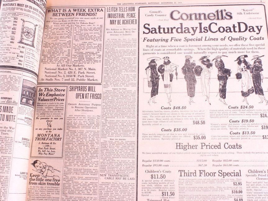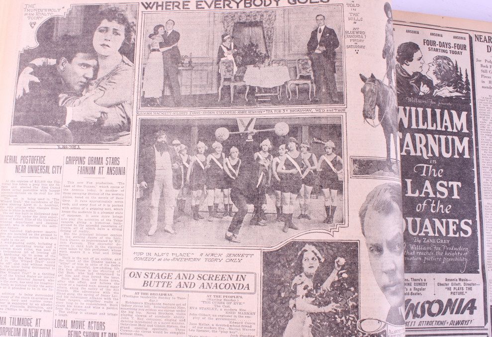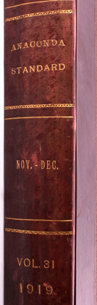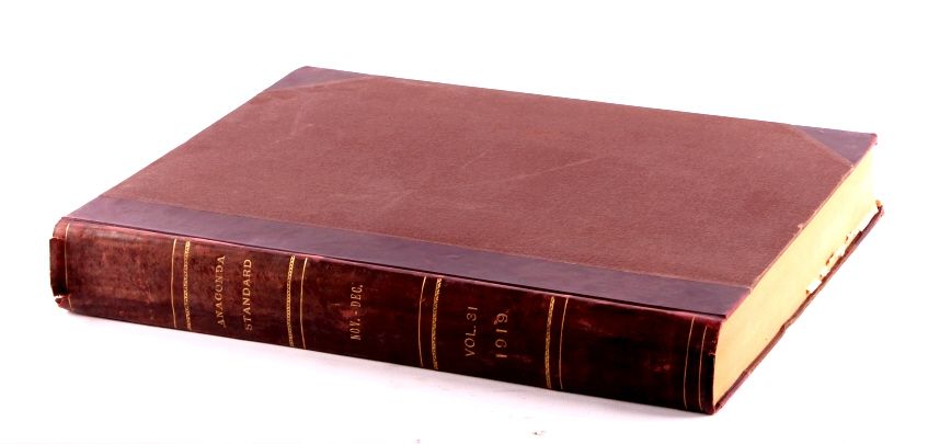 This is a 1919 Anaconda Standard newspaper book from Anaconda Montana. The book contains a collection of original newspapers from November and December of 1919. The book shows all the original articles and rare Montana advertising now mostly all lost. This rare book is believed to be complete with the intact binding. The papers edges show some wear, but overall a rare desirable piece. Measures 14 7/8"x21.5" and approximately 2" thick. There are only two or three of these 1919 books believed to exist: one for the Library of Congress, one for the Newspapers log, and possibly one for Montana's records.