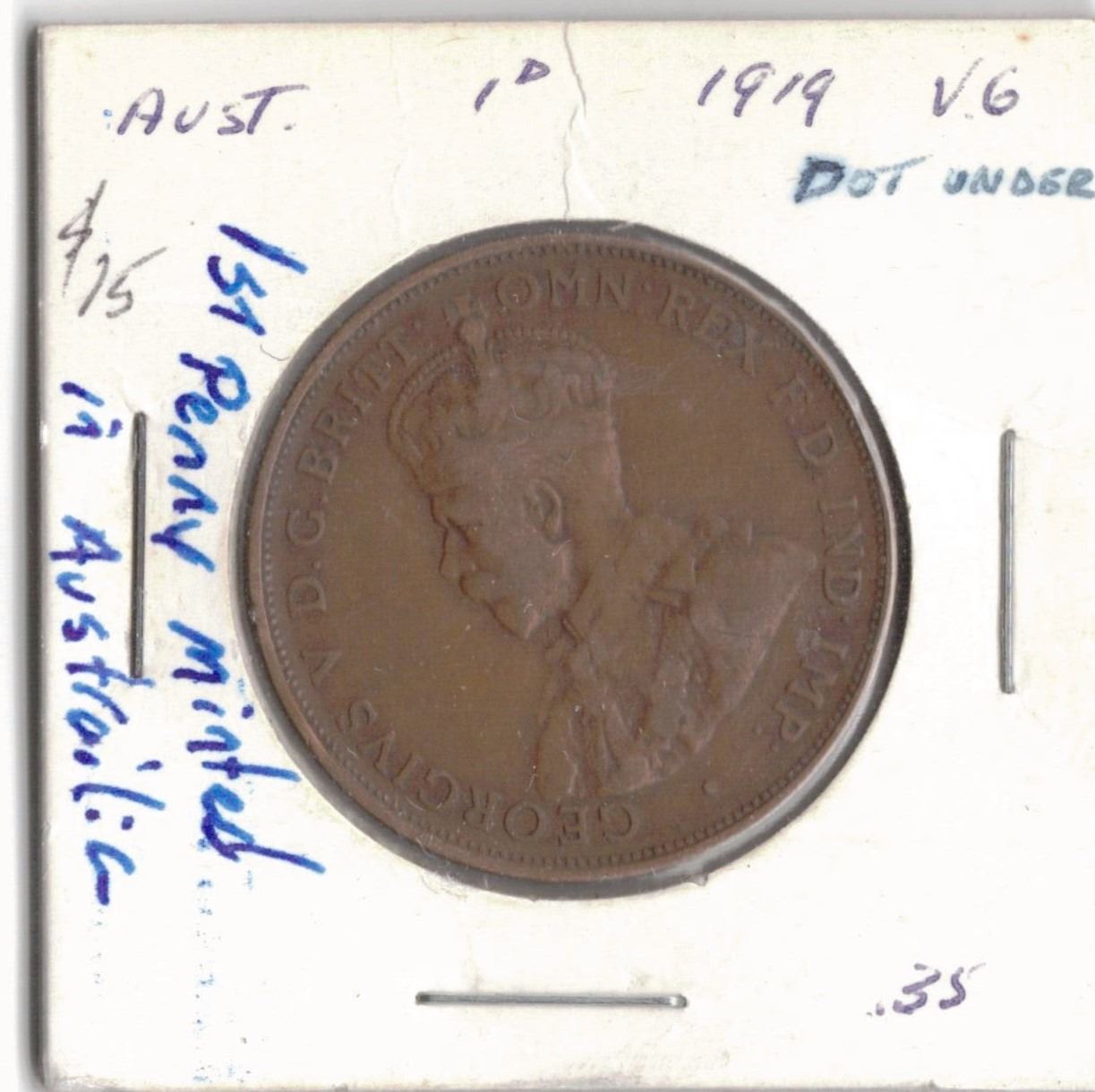 1919 Australian Penny. Australian Penny 1919 Dot under scroll low mintage 5,810,000