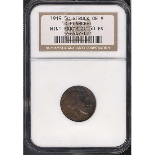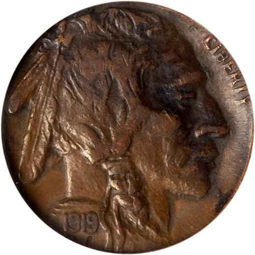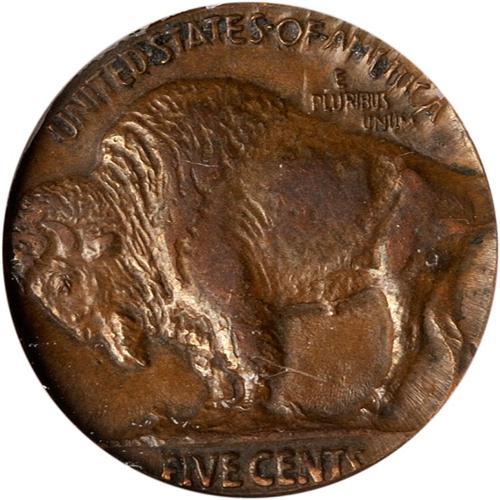 Struck on a Cent Planchet-Another popular and rare Off-Metal. This Buffalo Nickel, like the Liberty Nickel above, was also struck on a planchet intended for that year's cent. A dramatic and popular "Copper Buffalo" Off-Metal Striking.