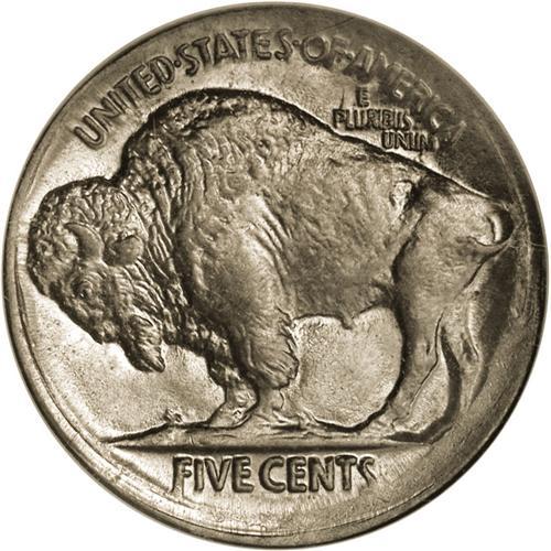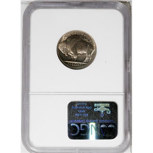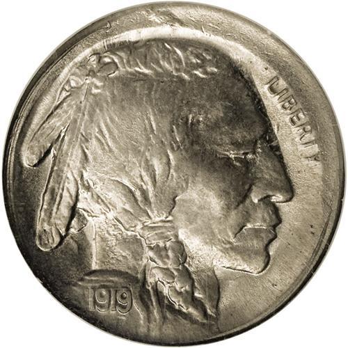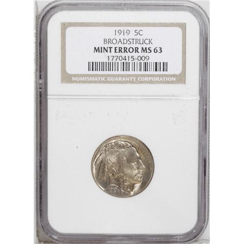 <B>1919 Buffalo Nickel<5C Error>--Broadstruck--MS63 NGC.</B></I> Uncentered toward 7:30, with a broad area of unstruck flan near 1:30. The major devices are unusually sharp, since the dies were able to approach without interference from the absent collar die. The curve of the tail, AMERICA, and LIBERTY are distorted toward the rim, as expected for the error. Light tan-gray toning confirms the originality.