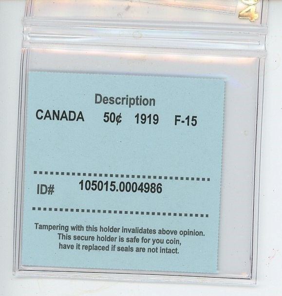 1919 CCCS GRADED CANADIAN FIFTY CENT COIN - F15