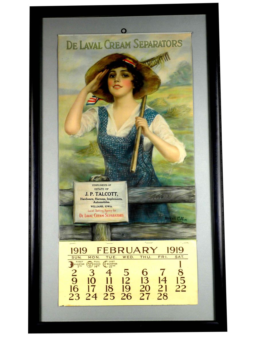 1919 Calendar for DeLavel Cream Separators, compliments of J.P. Talcott, Williams, IA. Original band at top, February page only. Excellent condition, framed under glass. 12 X 24 inches image only.