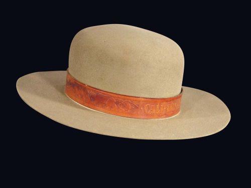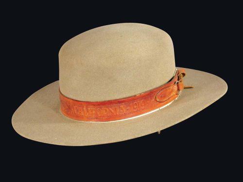 1919 California Uniform Hat, hand tooled trim with bear motif. Probably either a Law enforcement officers or a Forest Rangers. Gray felt. Excellent Condition. 14 X 4 inches.