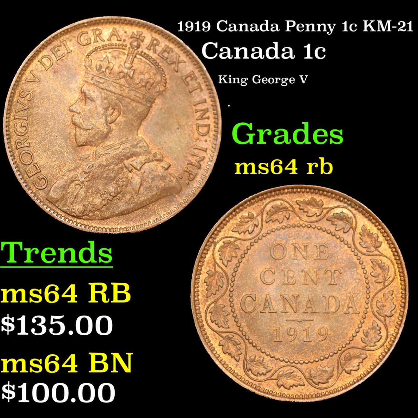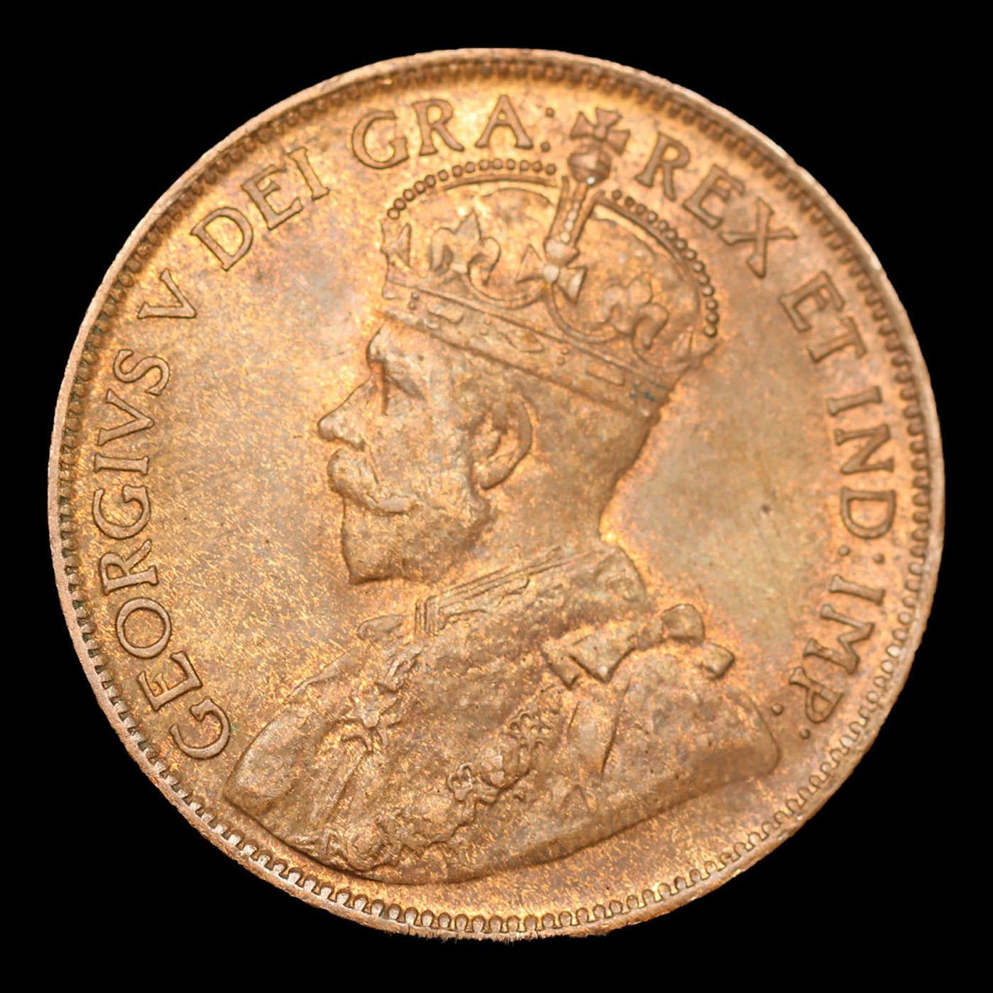 1919 Canada Penny 1c KM-21 Grades Choice Unc RB. George V was King of the United Kingdom and the British Dominions, and Emperor of India, from 6 May 1910 until his death in 1936.Born during the reign of his grandmother Queen Victoria, George was the second son of Albert Edward, Prince of Wales, and was third in the line of succession to the British throne behind his father and elder brother, Prince Albert Victor. From 1877 to 1892, George served in the Royal Navy, until the unexpected death of his elder brother in early 1892 put him directly in line for the throne. On Victoria's death in 1901, George's father ascended the throne as Edward VII, and George was created Prince of Wales. He became king-emperor on his father's death in 1910.George's reign saw the rise of socialism, communism, fascism, Irish republicanism, and the Indian independence movement, all of which radically changed the political landscape of the British Empire. The Parliament Act 1911 established the supremacy of the elected British House of Commons over the unelected House of Lords. As a result of the First World War (1914–1918), the empires of his first cousins Nicholas II of Russia and Wilhelm II of Germany fell, while the British Empire expanded to its greatest effective extent. In 1917, he became the first monarch of the House of Windsor, which he renamed from the House of Saxe-Coburg and Gotha as a result of anti-German public sentiment. In 1924, George appointed the first Labour ministry and the 1931 Statute of Westminster recognized the Empire's dominions as separate, independent states within the British Commonwealth of Nations.He suffered from smoking-related health problems throughout much of his later reign, and at his death was succeeded by his eldest son, Edward VIII.