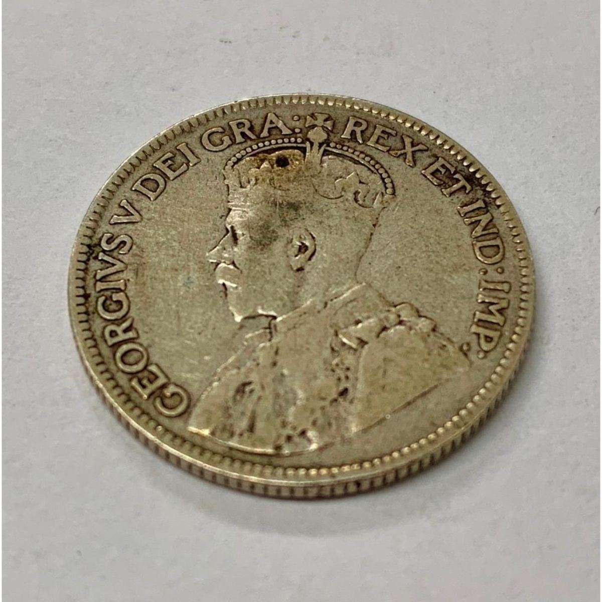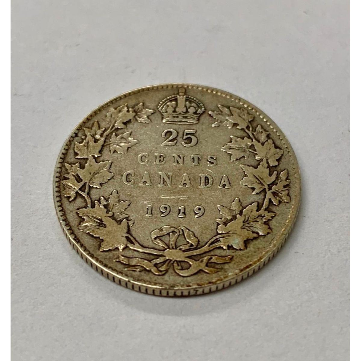 Obverse The portrait in left profile of George V is surrounded with the inscription "GEORGIVS V DEI GRA: REX ET IND:IMP" (George V, King and Emperor of India by the grace of God) Lettering:Â GEORGIVS V DEI GRA: REX ET IND:IMP: Reverse The facial value, accompanied with the inscription "CANADA", is surrounded with two maple boughs and a crown Lettering:Â 25 CENTS CANADA 1914 Alloy: 92.5% silver, 7.5% copper