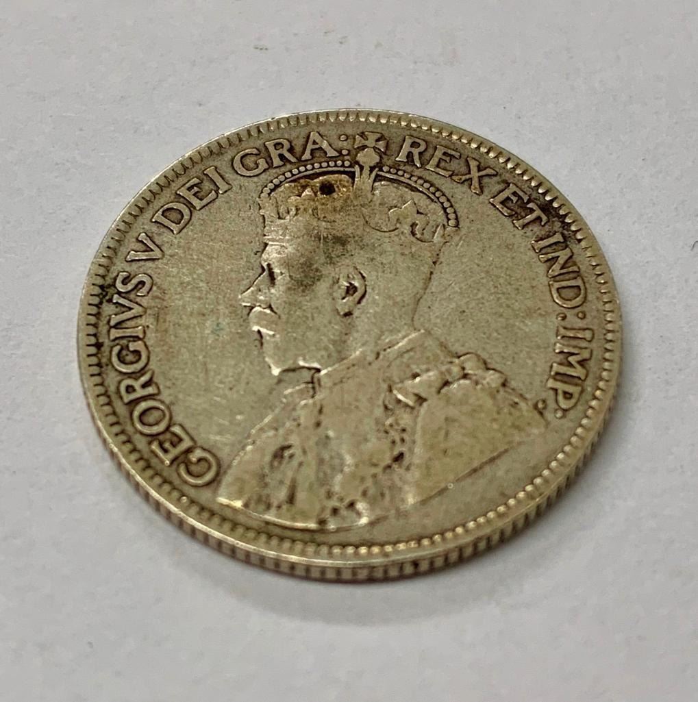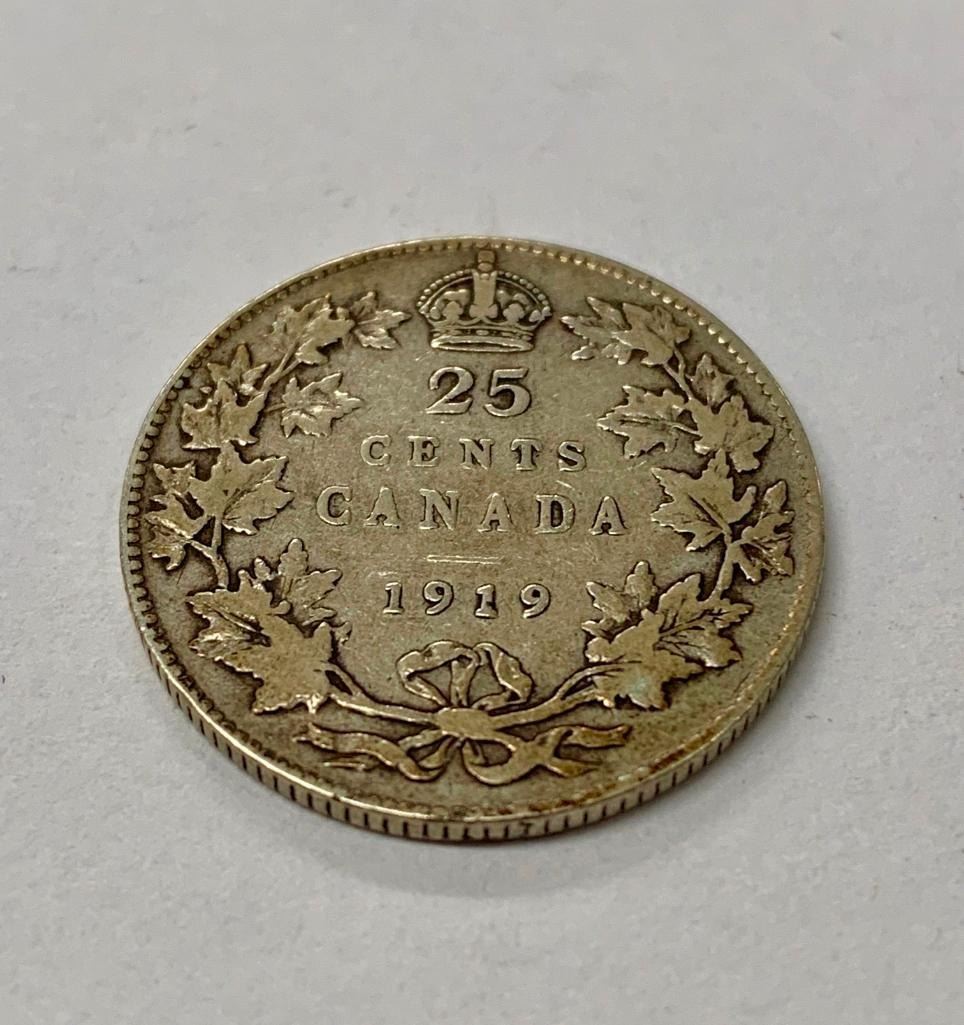 Obverse The portrait in left profile of George V is surrounded with the inscription "GEORGIVS V DEI GRA: REX ET IND:IMP" (George V, King and Emperor of India by the grace of God) Lettering: GEORGIVS V DEI GRA: REX ET IND:IMP: Reverse The facial value, accompanied with the inscription "CANADA", is surrounded with two maple boughs and a crown Lettering: 25 CENTS CANADA 1914 Alloy: 92.5% silver, 7.5% copper