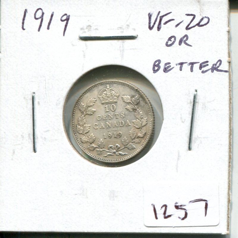 1919 Canadian Silver 10 Cents. VF-20 or better. Nice.