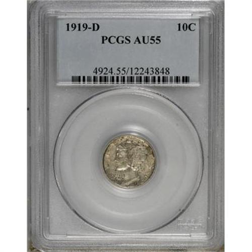 <B>1919-D 10C AU55 PCGS.</B></I> . PCGS Population (17/262). NGC Census: (3/192). Mintage: 9,939,000. Numismedia Wsl. Price for NGC/PCGS coin in AU55: $68. (#4924)<BR><BR><B>Coin Engraver:</B> Adolph A. Weinman<BR><BR><b>Shipping:</b> Coins & Currency (<a target="_blank" href="http://www.heritageauctions.com/common/shipping.php">view shipping information</a>)