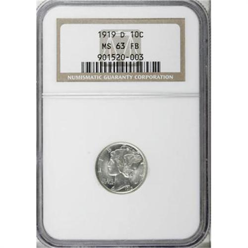 <B>1919-D 10C MS63 Full Bands NGC.</B></I> Well struck and highly lustrous, with essentially untoned silver surfaces that have a bright satiny appearance across each side. The central reverse bands are crisply detailed. A few tiny marks are noted that seem minimal for the Select Uncirculated grade level. A scarce early issue that is very elusive with fully split bands. Census: 26 in 63, 44 finer (3/08). <BR><BR><B>Coin Engraver:</B> Adolph A. Weinman<BR><BR><b>Shipping:</b> Coins & Currency (<a target="_blank" href="http://www.heritageauctions.com/common/shipping.php">view shipping information</a>)