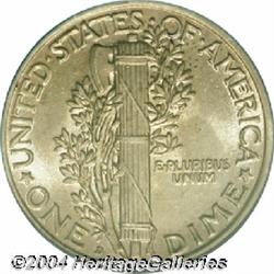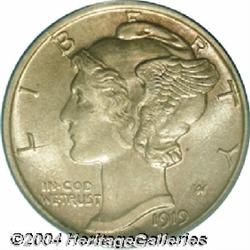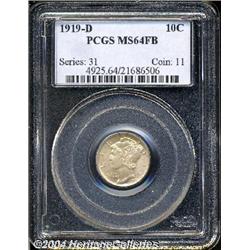 <B>1919-D<10C> MS64 Full Bands PCGS.</B></I> The obverse die of this example was probably on the verge of discard with several prominent die cracks extending radially from the border. Wisps of pale golden-lilac toning are seen on each side with underlying frosty luster. This is sharply struck with excellent details within Liberty's hair and the wing on the obverse. Not only are the central bands well details as suggested by the Full Bands designation, but all other details are also well defined. <BR><BR><B>Important notice:</B> Heritage usually auctions material at the rate of 200-250 lots per hour. On some occasions eBay Live bid software or the Internet may not be able to keep up with the pace of the auction. We recommend placing a realistic absentee bid now as insurance to avoid disappointment. Occasionally the auctioneer may eliminate or reject an eBay Live bid, and the auctioneer may also reopen a lot after the close of the eBay live bidding (usually because we missed an audience bid), and may reject your bid even if it shows you as the winning bidder. By bidding via eBay Live, you agree that Heritage may award the lot to another bidder at its sole discretion under the circumstances described above or any other reasonable circumstances. Since eBay bids are not shown to us until we open the lot on the floor, we treat those bids just like floor bids. In most cases the floor responds before the eBay bid is presented to us, due to Internet lag time, so for consistency we have made it a policy that floor bids are always considered first over tie eBay live bids. Also please note that all Heritage lots purchased through eBay Live carry a 20% Buyer's Premium. Please make sure you read the Terms and Conditions before you bid.
