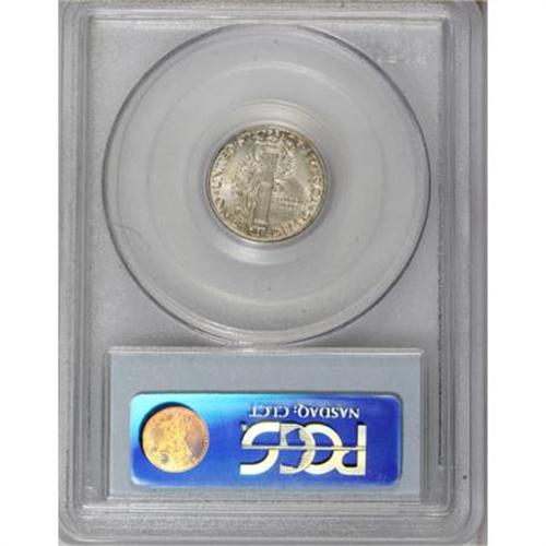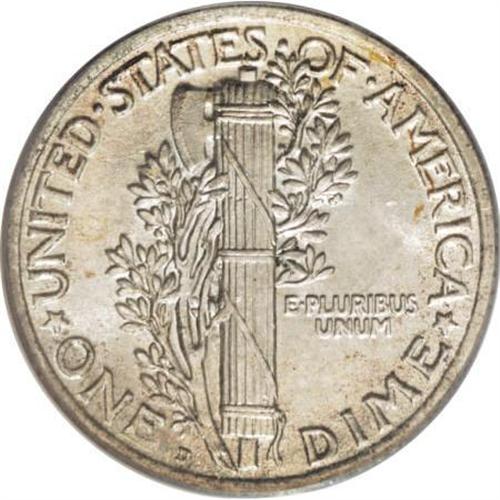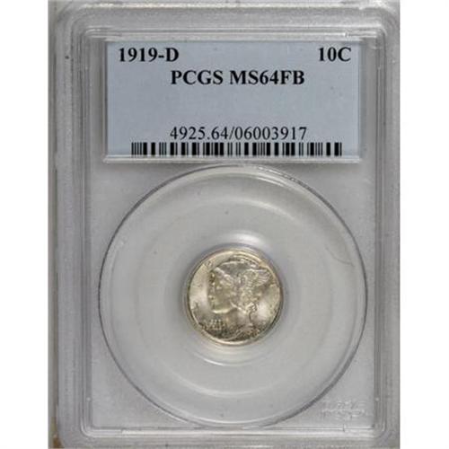 <B>1919-D 10C MS64 Full Bands PCGS.</B></I> Delicate chestnut toning graces this lustrous and beautifully preserved near-Gem. Hair-thin obverse die cracks are noted at 6, 7, and 12 o'clock, but no abrasions are visible. The centers are needle-sharp. The 1919-D is a famous conditional rarity, common in circulated grades but non-collectible as a Superb Gem. Population: 65 in 64, 18 finer (8/07).<BR><BR><B>Coin Engraver:</B> Adolph A. Weinman<BR><BR><b>Shipping:</b> Coins & Currency (<a target="_blank" href="http://www.heritageauctions.com/common/shipping.php">view shipping information</a>)