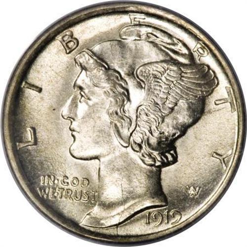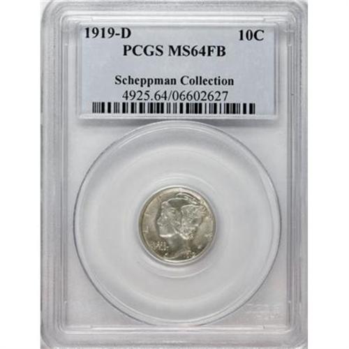 <B>1919-D 10C MS64 Full Bands PCGS.</B></I> A boldly impressed and strongly lustrous survivor from an issue of slightly under 10 million pieces. The overall visual appeal is excellent, and only a few peripheral hints of gold and silver-gray keep this piece from full brilliance. Elegant eye appeal despite a handful of wispy flaws that preclude Gem status. Population: 67 in 64 Full Bands, 18 finer (12/07).<BR><I>From The Scheppman Collection, #4 PCGS Registry of Full Band Mercury Dimes.</B></I><BR><BR><B>Coin Engraver:</B> Adolph A. Weinman<BR><BR><b>Shipping:</b> Coins & Currency (<a target="_blank" href="http://www.heritageauctions.com/common/shipping.php">view shipping information</a>)