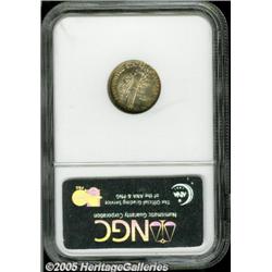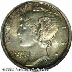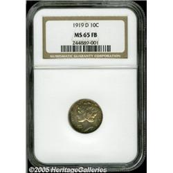 <B>1919-D 10C MS65 Full Bands NGC.</B></I> A conditionally rare early Mercury that is extremely elusive with fully split bands. This is a strongly detailed coin that also has well defined peripheries. The thick, satiny luster is covered with colorful hues of green, crimson, russet, and gold that deepens at the borders over both sides. There are no distracting blemishes, just a few microscopic ticks in the center of the obverse. The elusiveness of this issue is apparent in the population reports. NGC and PCGS combined have certified only 15 specimens at this level, with just five finer (2/05). Moreover, our auction records indicate that the major auction houses have offered, over the last ten or so years, only ten coins graded MS65 and four rated finer. Population: 4 in 65, 0 finer (2/05).