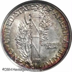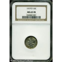 1919-D 10C MS65 Full Bands NGC. A conditionally ra <B>1919-D 10C MS65 Full Bands NGC.</B></I> A conditionally rare early Mercury that is extremely elusive with fully split bands. This is a strongly detailed coin that also has well defined peripheries. The thick, satiny luster is covered with colorful hues of green, crimson, russet, and gold that deepens at the borders over both sides. There are no distracting blemishes, just a few microscopic ticks in the center of the obverse. Some clockwise die rotation is also noted, an unusual occurrence on this issue. Population: 4 in 65, 0 finer (11/04). <BR><BR><B>Important notice:</B> Heritage usually auctions material at the rate of 200-250 lots per hour. On some occasions eBay Live bid software or the Internet may not be able to keep up with the pace of the auction. We recommend placing a realistic absentee bid now as insurance to avoid disappointment. Occasionally the auctioneer may eliminate or reject an eBay Live bid, and the auctioneer may also reopen a lot after the close of the eBay live bidding (usually because we missed an audience bid), and may reject your bid even if it shows you as the winning bidder. By bidding via eBay Live, you agree that Heritage may award the lot to another bidder at its sole discretion under the circumstances described above or any other reasonable circumstances. Since eBay bids are not shown to us until we open the lot on the floor, we treat those bids just like floor bids. In most cases the floor responds before the eBay bid is presented to us, due to Internet lag time, so for consistency we have made it a policy that floor bids are always considered first over tie eBay live bids. Also please note that all Heritage lots purchased through eBay Live carry a 20% Buyer's Premium. Please make sure you read the Terms and Conditions before you bid. This lot is being auctioned in conjunction with a live floor auction by Heritage Galleries & Auctioneers. All final auction and invoice information will be supplied by Heritage Galleries & Auctioneers, and all other information should be considered preliminary. Lot:5801