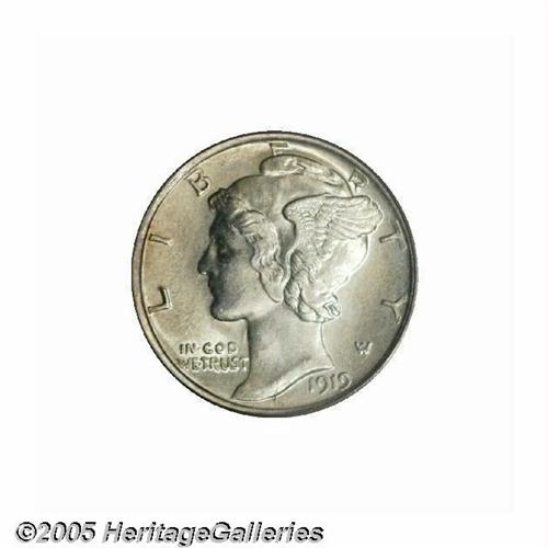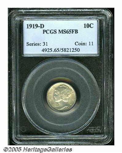 <B>1919-D<10C> MS65 Full Bands PCGS.</B></I> The 1919-D is one of the major strike and condition rarities in the Mercury dime series. It is also a coin that is infrequently encountered with strong peripheral details. On this particular coin, there is very little weakness around the margins, what weakness there is being limited to the tops of the letters of LIBERTY on the obverse. This piece has thick mint luster that glows through the even golden toning that is draped over each side. There are no obvious abrasions present on either side of this splendid Gem example. Population: 12 in 65, 5 finer (6/05).