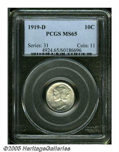 <B>1919-D<10C> MS65 PCGS.</B></I> Lovely Gem example with undulating lustrous surfaces that hold a few speckled sunset areas. Lovingly preserved with only the tiniest of flaws.