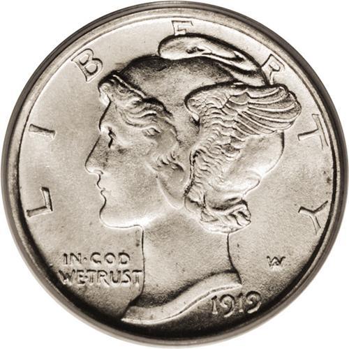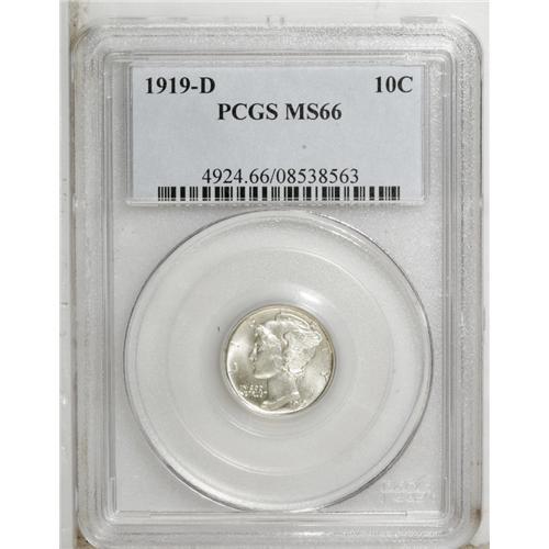 <B>1919-D<10C> MS66 PCGS.</B></I> The 1919-D was underappreciated for many years, since its mintage of close to 10 million pieces is low but unexceptional for the era. In Mint State, however, the issue is scarce, and the 1919-D is rare in MS65 and higher grades. A lightly toned and virtually unabraded piece with a strongly matte-like obverse. The central bands are blended. Population: 4 in 66, 0 finer (9/06).