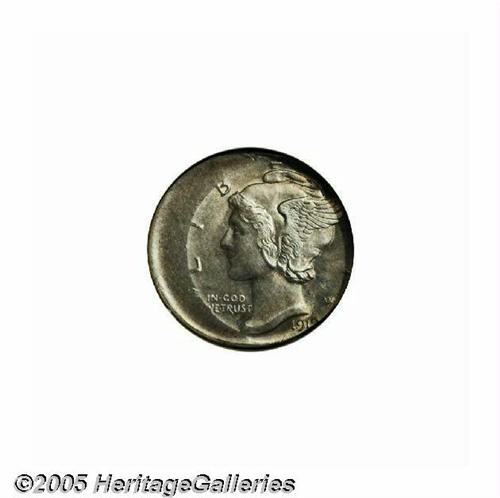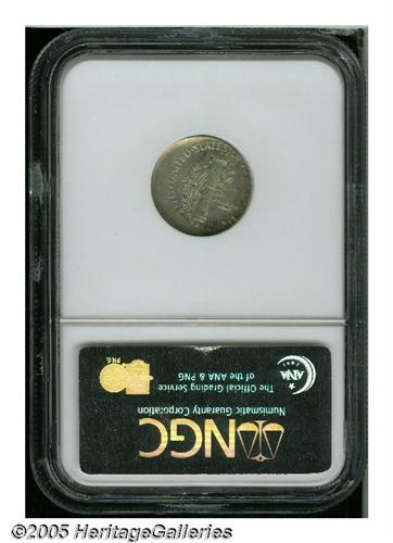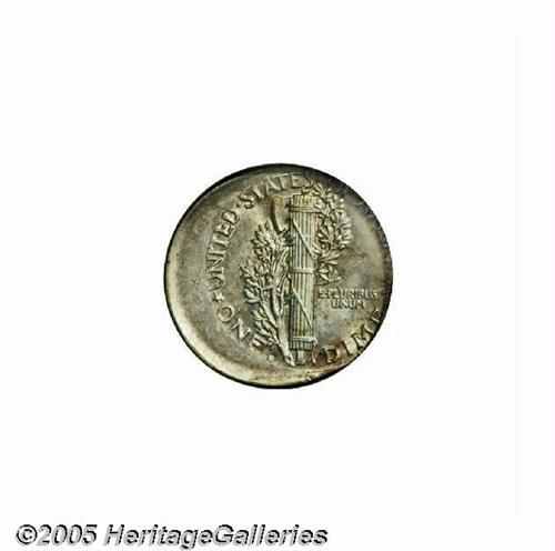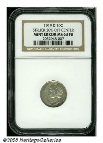 <B>1919-D<10C> Mercury Dime--Struck 20% Off Center--MS63 Full Bands NGC.</B></I> Struck off-center at 3 o'clock with the reverse also slightly rotated. Sharply struck as are all off-center coins. This example has satiny luster with pale champagne toning. A wonderful example.