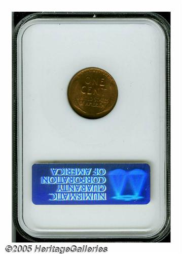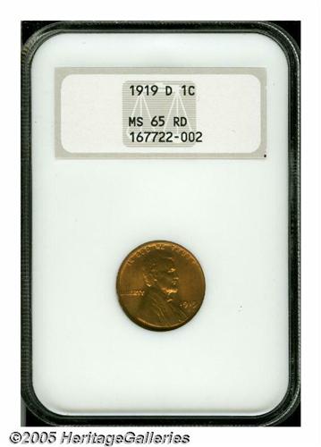 <B>1919-D<1C> MS65 Red NGC.</B></I> While a relatively high mintage issue with more than 57 million pieces produced, the '19-D is a scarce issue in Gem condition and with full red color. This is a bright, lustrous coin whose only flaw is a very slight weakness of strike on the reverse. Population: 19 in 65, 0 finer (6/05).