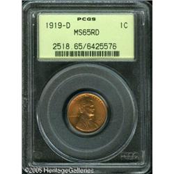 <B>1919-D 1C MS65 Red PCGS.</B></I> Mint red-orange color dominates lustrous surfaces on each side of this sharply struck D-mint Lincoln cent. A few small flecks are scattered about, none of which are overly bothersome. Lot:5456