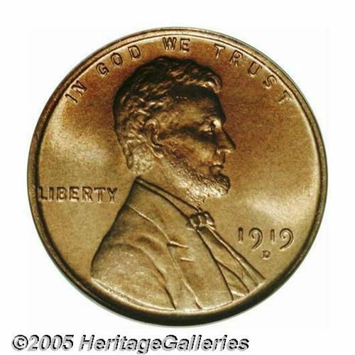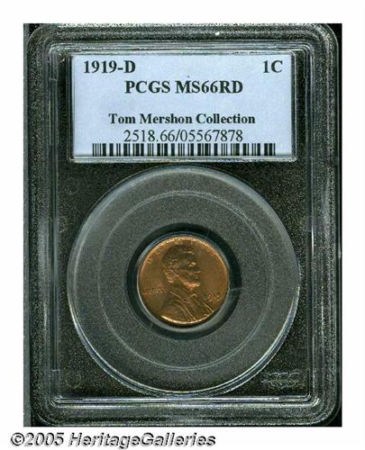 <B>1919-D<1C> MS66 Red PCGS.</B></I> Despite a generous mintage of over 57 million pieces, relatively few 1919-D Cents were spared from circulation. Those that did are most often produced from noticeably worn dies and only occasionally can a Mint State survivor accurately be termed fully struck. Here is one such example. Both sides exhibit fiery orange-red color and a refreshing absence of carbon, with surfaces that are equally up to the task of its Premium Gem rating. Population: 11 in 66, 1 finer (3/05).<BR><I>From The Tom Mershon #2 All-Time PCGS Registry Set of Lincoln Wheat Cents.</B></I>