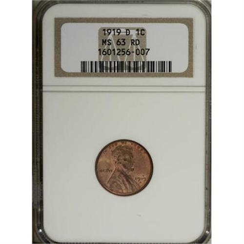 <B>1919-D 1C MS63 Red NGC.</B></I> NGC Census: (16/72). PCGS Population (57/218). Mintage: 57,154,000. Numismedia Wsl. Price for NGC/PCGS coin in MS63: $150. (#2518)<BR><BR><B>Coin Engraver:</B> Victor D. Brenner<BR><BR><b>Shipping:</b> Coins & Currency (<a target="_blank" href="http://www.heritageauctions.com/common/shipping.php">view shipping information</a>)