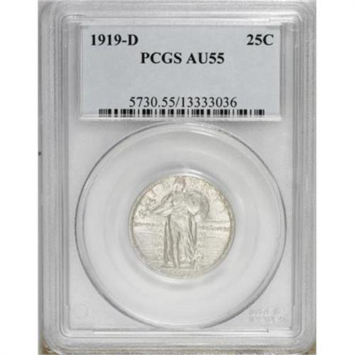 <B>1919-D 25C AU55 PCGS.</B></I> PCGS Population (26/245). NGC Census: (14/165). Mintage: 1,944,000. Numismedia Wsl. Price for NGC/PCGS coin in AU55: $454. (#5730)<BR><BR><B>Coin Engraver:</B> Hermon A. MacNeil<BR><BR><b>Shipping:</b> Coins & Currency (<a target="_blank" href="http://www.heritageauctions.com/common/shipping.php">view shipping information</a>)
