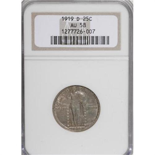 <B>1919-D 25C AU58 NGC.</B></I> NGC Census: (31/135). PCGS Population (47/201). Mintage: 1,944,000. Numismedia Wsl. Price for NGC/PCGS coin in AU58: $775. (#5730)<BR><BR><B>Coin Engraver:</B> Hermon A. MacNeil<BR><BR><b>Shipping:</b> Coins & Currency (<a target="_blank" href="http://www.heritageauctions.com/common/shipping.php">view shipping information</a>)