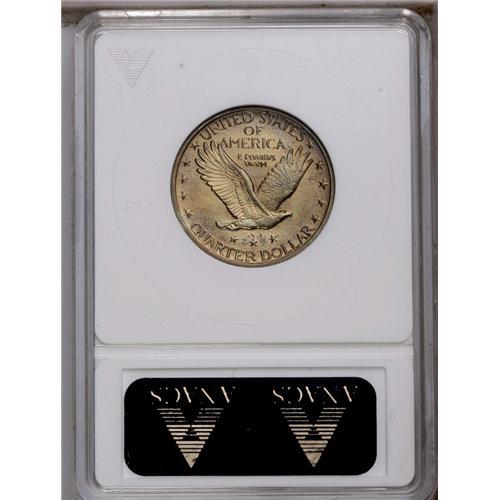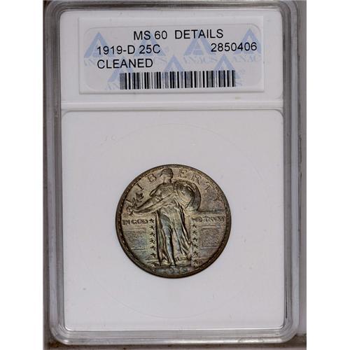 <B>1919-D<25C>--Cleaned--ANACS. MS60 Details.</B></I> Horizontal hairlines are faintly visible across the reverse, but subsequent apple-green, yellow, lilac, and ice-blue toning makes the cleaning of this lustrous piece less obtrusive. Although not designated as such by ANACS, the head qualifies as full, since the ear hole, sprigs, and hairline are apparent.