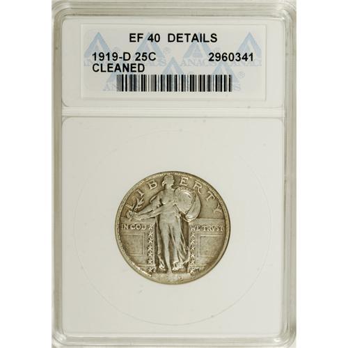 <B>1919-D 25C --Cleaned--ANACS. XF40 Details.</B></I> NGC Census: (15/197). PCGS Population (14/287). Mintage: 1,944,000. Numismedia Wsl. Price for NGC/PCGS coin in XF40: $321. (#5730)<BR><BR><b>Shipping:</b> Coins & Currency (<a target="_blank" href="http://www.heritageauctions.com/common/shipping.php">view shipping information</a>)