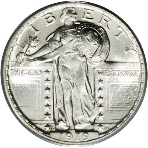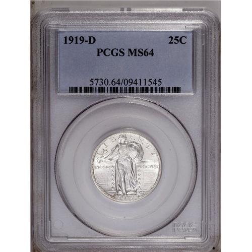<B>1919-D<25C> MS64 PCGS.</B></I> Despite the lack of full head details, the strike is actually better than usual on this typically weakly struck issue, which has long been acknowledged as a key and conditionally rare date. The head details are about 60% present, but more importantly, elsewhere the strike is bold and pleasing. The beautiful surfaces are brilliantly lustrous and untoned. Standing Liberty quarter specialist J.H. Cline has repeatedly pointed out how rewarding it can be to explore the considerable opportunities presented by non-Full Head, better-date quarters in MS64 and higher grades. Perhaps now is the time to begin that exploration with this pleasing example.