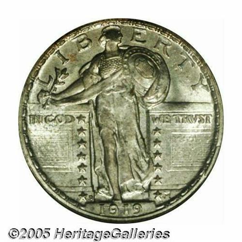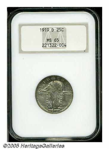 <B>1919-D<25C> MS65 NGC.</B></I> This is a highly lustrous Gem with satiny surfaces beneath golden brown and iridescent toning. Although the head details are not fully defined, this is a much sharper strike than many, and highly desirable as such.<BR><I>From The Clifford Columbus Collection.</B></I>