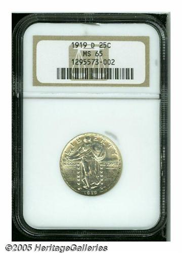 <B>1919-D<25C> MS65 NGC.</B></I> Well struck save for minor incompleteness on the side of Liberty's head, and on the eagle's breast. The bright, satiny surfaces are snow-white in the fields, and in the centers, with faint toning near the borders. Both obverse and reverse seem to be pristine. A very scarce date in higher grades.
