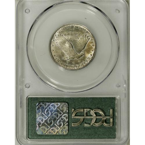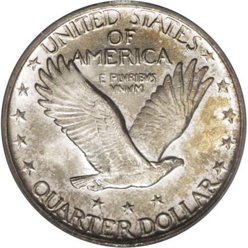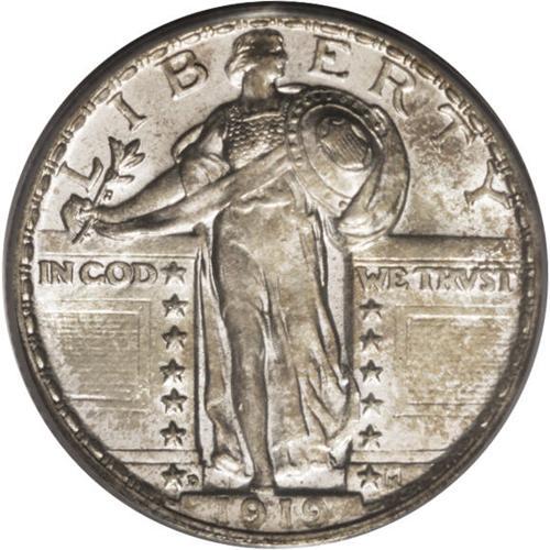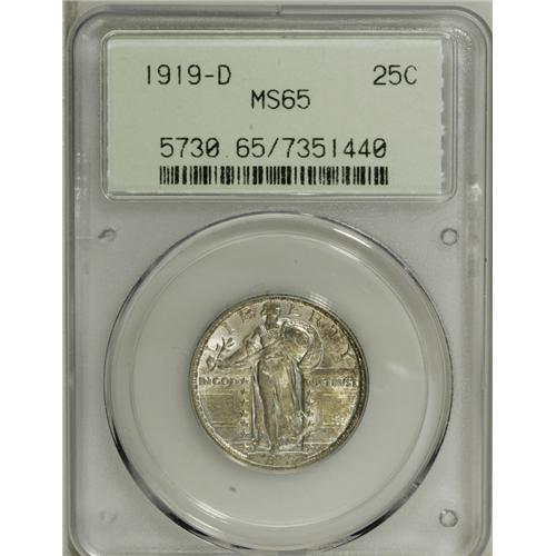 <B>1919-D 25C MS65 PCGS.</B></I> Few examples of this date are seen with full head details and a sharp strike elsewhere. One pundit estimates Full Head examples constitute less than 1% of the surviving population. The present piece offers considerably better definition than usually encountered, with most of the shield rivets in place and considerable detail on Liberty's head, while falling short of the requirements for a Full Head designation. Brilliant luster radiates from both sides of this Gem, with mostly untoned surfaces accented in gold and ice-blue. Encapsulated in a first-generation small PCGS holder. Population: 37 in 65, 22 finer (12/06).<BR><BR><b>Shipping:</b> Coins & Currency (<a target="_blank" href="http://www.heritageauctions.com/common/shipping.php">view shipping information</a>)