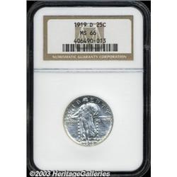 1919-D 25C MS66 NGC. The 1919-D, one just over 1.9 million pieces struck, is not only one of the best known condition scarcities in Standing Liberty Quarter series, but it is also extremely challenging to locate a boldly struck example. This satiny-white Gem, while not quite sharp enough to warrant a Full Head designation, is still impressively bold for the date and the radiant surfaces are nearly void of contact marks. Population: 16 in 66, 1 finer (11/03). Important notice: Heritage usually auctions material at the rate of 200-250 lots per hour. On some occasions eBay Live bid software or the Internet may not be able to keep up with the pace of the auction. We recommend placing a realistic absentee bid now as insurance to avoid disappointment. Occasionally the auctioneer may eliminate or reject an eBay Live bid, and the auctioneer may also reopen a lot after the close of the eBay live bidding (usually because we missed an audience bid), and may reject your bid even if it shows you as the winning bidder. By bidding via eBay Live, you agree that Heritage may award the lot to another bidder at its sole discretion under the circumstances described above or any other reasonable circumstances. Also please note that all Heritage lots purchased through eBay Live carry a 20% Buyer's Premium. Please make sure you read the Terms and Conditions before you bid.