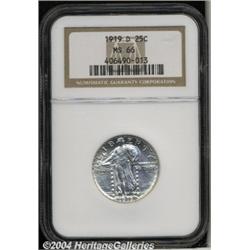 <B>1919-D<25C> MS66 NGC.</B></I> The 1919-D quarter, with a mintage of just over 1.9 million pieces, is not only one of the best known condition rarities in the Standing Liberty Quarter series, but is also extremely challenging to locate with bold design features. In fact, the Denver Mint coinage of 1919 in nearly every denomination is rare in high grade. This satiny-white Gem, while not quite sharp enough to warrant a Full Head designation, is still impressively bold for the date and the radiant surfaces are nearly void of contact marks. <BR><BR><B>Important notice:</B> Heritage usually auctions material at the rate of 200-250 lots per hour. On some occasions eBay Live bid software or the Internet may not be able to keep up with the pace of the auction. We recommend placing a realistic absentee bid now as insurance to avoid disappointment. Occasionally the auctioneer may eliminate or reject an eBay Live bid, and the auctioneer may also reopen a lot after the close of the eBay live bidding (usually because we missed an audience bid), and may reject your bid even if it shows you as the winning bidder. By bidding via eBay Live, you agree that Heritage may award the lot to another bidder at its sole discretion under the circumstances described above or any other reasonable circumstances. Since eBay bids are not shown to us until we open the lot on the floor, we treat those bids just like floor bids. In most cases the floor responds before the eBay bid is presented to us, due to Internet lag time, so for consistency we have made it a policy that floor bids are always considered first over tie eBay live bids. Also please note that all Heritage lots purchased through eBay Live carry a 20% Buyer's Premium. Please make sure you read the Terms and Conditions before you bid. </span></font></tr></table></td></tr></table>