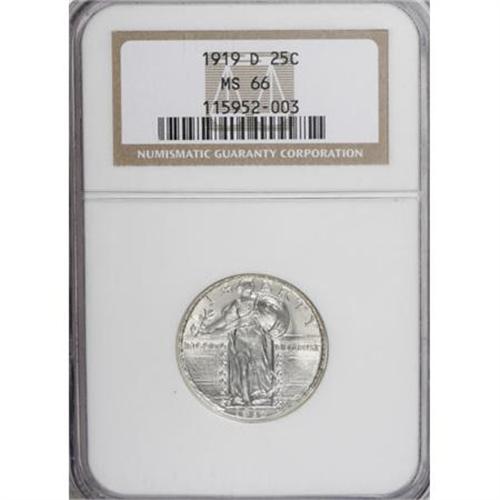 <B>1919-D 25C MS66 NGC.</B></I> This brilliant Premium Gem is flawless from a technical perspective, since the lustrous surfaces are unabraded. The strike is typical for this better date issue, which has a mintage of only 1,944,000 pieces. An interesting obverse rim die break is noted at 4 o'clock. Census: 16 in 66, 1 finer (6/07).<BR><I>From The Belle Glade Collection, Part Two.</B></I><BR><BR><B>Coin Engraver:</B> Hermon A. MacNeil<BR><BR><b>Shipping:</b> Coins & Currency (<a target="_blank" href="http://www.heritageauctions.com/common/shipping.php">view shipping information</a>\)