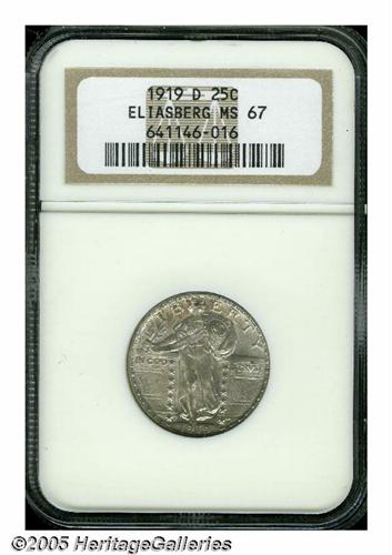 <B>1919-D<25C> MS67 NGC.</B></I> One of the scarcer dates from this very popular series and a memorable coin for the specialist. The surfaces are a delight to behold, with delicate heather and silvery-blue hues over luster. As to the strike, this one is quite strong, about 80 percent of a full head, quite strong for this date and mint. It is apparent that this coin was set aside at the time of issue and numismatically preserved from that time forward. Such quality is never cheap, and can seldom be duplicated at any price. An absolute jewel for the specialist who appreciates great surfaces, luster, strike and pedigree. The combined NGC and PCGS Population reports show only two coins graded this high with none seen finer by either service. <BR><I>Ex: Bowers and Merena's Eliasberg Sale (April 1997), lot 1632 and the pedigree is noted on the NGC insert.</B></I><BR><I>From The Robert Moreno Collection.</B></I>