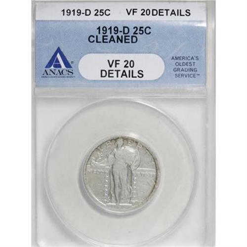 <B>1919-D 25C --Cleaned--ANACS VF20 Details.</B></I> NGC Census: (6/235). PCGS Population (6/350). Mintage: 1,944,000. Numismedia Wsl. Price for NGC/PCGS coin in VF20: $250. (#5730)<BR><BR><B>Coin Engraver:</B> Hermon A. MacNeil<BR><BR><b>Shipping:</b> Coins & Currency (<a target="_blank" href="http://www.heritageauctions.com/common/shipping.php">view shipping information</a>)