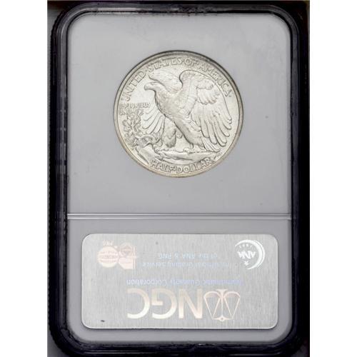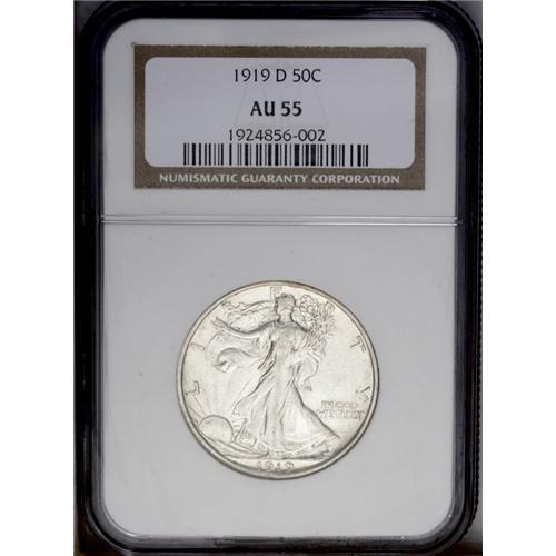 <B>1919-D<50C> AU55 NGC.</B></I> An affordable example of this rare, key issue in the Walking Liberty half series. A bit softly struck in the centers, as one would expect from this issue, light friction is also seen over these same highpoints. Surprisingly lustrous and almost devoid of color. <BR><BR><B>Important notice:</B> Heritage usually auctions material at the rate of 200-250 lots per hour. On some occasions eBay Live bid software or the Internet may not be able to keep up with the pace of the auction. We recommend placing a realistic absentee bid now as insurance to avoid disappointment. Occasionally the auctioneer may eliminate or reject an eBay Live bid, and the auctioneer may also reopen a lot after the close of the eBay live bidding (usually because we missed an audience bid), and may reject your bid even if it shows you as the winning bidder. By bidding via eBay Live, you agree that Heritage may award the lot to another bidder at its sole discretion under the circumstances described above or any other reasonable circumstances. Since eBay bids are not shown to us until we open the lot on the floor, we treat those bids just like floor bids. In most cases the floor responds before the eBay bid is presented to us, due to Internet lag time, so for consistency we have made it a policy that floor bids are always considered first over tie eBay live bids. Also please note that all Heritage lots purchased through eBay Live carry a 20% Buyer's Premium. Please make sure you read the Terms and Conditions before you bid. This lot is being auctioned in conjunction with a live floor auction by Heritage Galleries & Auctioneers. All final auction and invoice information will be supplied by Heritage Galleries & Auctioneers, and all other information should be considered preliminary. Lot:2923 <BR><BR><B>Winning Notification and Billing:</B> After the FINAL session in this auction is complete, Heritage will send e-mail and snail mail invoices. This process normally takes several days. All final auction and invoice information will be supplied by Heritage Galleries & Auctioneers, and all other information should be considered preliminary. <BR><BR>This auction will be conducted on a live auction floor and over the Internet through eBay Live. If you choose to place an absentee bid, please take a moment to <font color='#0000ff'><u><a href='http://pages.ebay.com/liveauctions/help/before/laabsentee.html'>learn how eBay Live absentee bidding works</a></u></font><font color='#000000'>