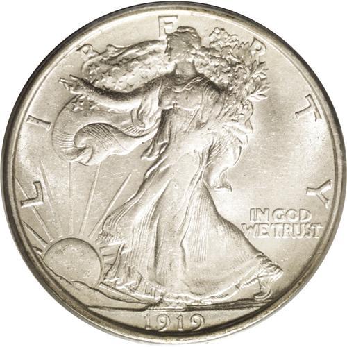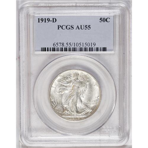 <B>1919-D<50C> AU55 PCGS.</B></I> A rare and collectible coin even in Choice AU condition, as here. All three of the 1919 issues are seldom seen in high grade, the mintmarked issues even less so. This lovely coin offers light silver-gray surfaces that show just a trace of rub on the highpoints, along with a soft strike through the centers.